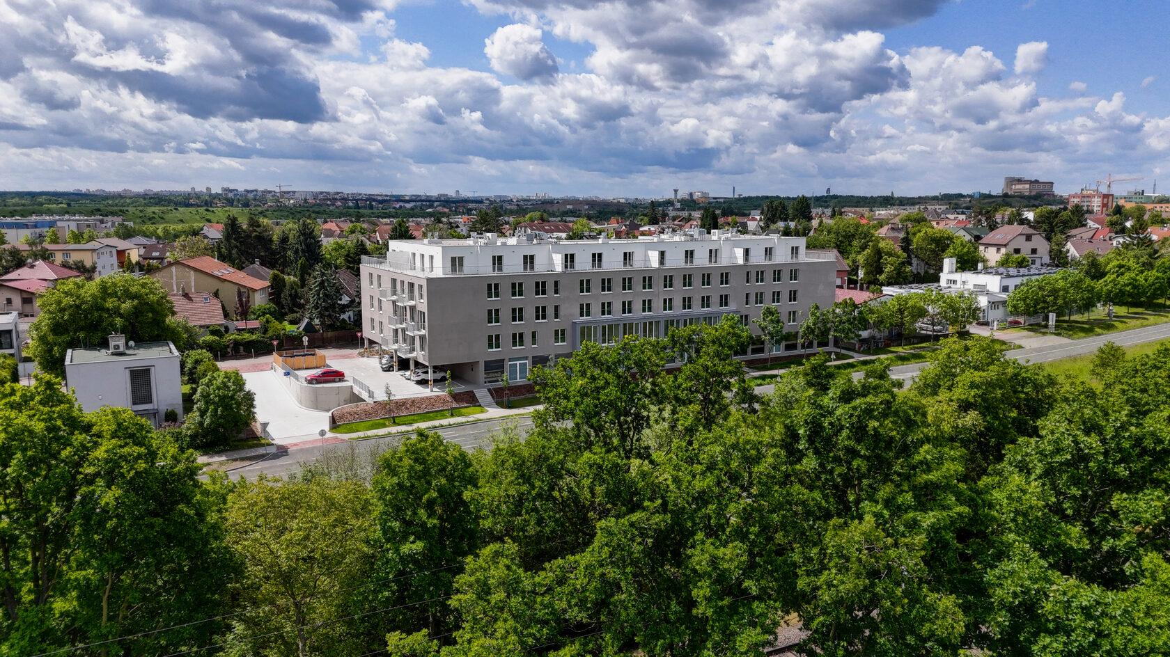 Zelené Kaskády is located in the prestigious Hostavice villa district and comprises 86 apartments ranging from 1+kk to 5+kk layouts. The architectural concept emphasizes spacious interiors with large-format windows and cascading terraces, creating bright yet intimate living spaces. Terraces of up to 117 m² are ready for personalized landscaping.
